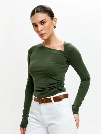 Хлопковый асимметричный лонгслив Jane с длинными рукавами комфортно садится и отлично работает как базовый слой. Брюки Lite из базовой коллекции — это те самые длинные брюки для высоких женщин, которые лежат на полу и красиво формируют силуэт (модель также доступна на WB).