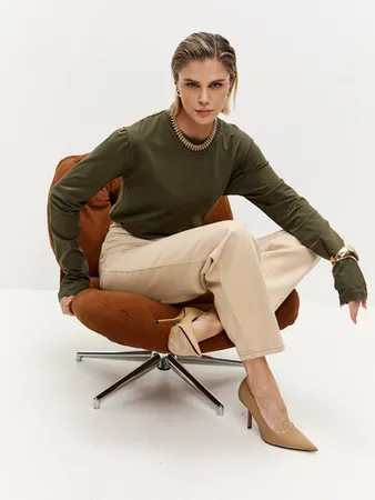 На Дарье, стилисте бренда EVERY PERSON (рост 182 см): свитшот Reed, брюки Lite и хлопковый лонгслив в оттенке хаки.