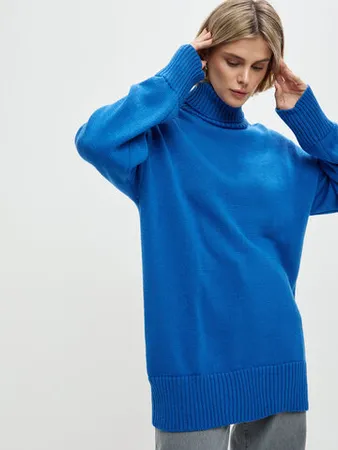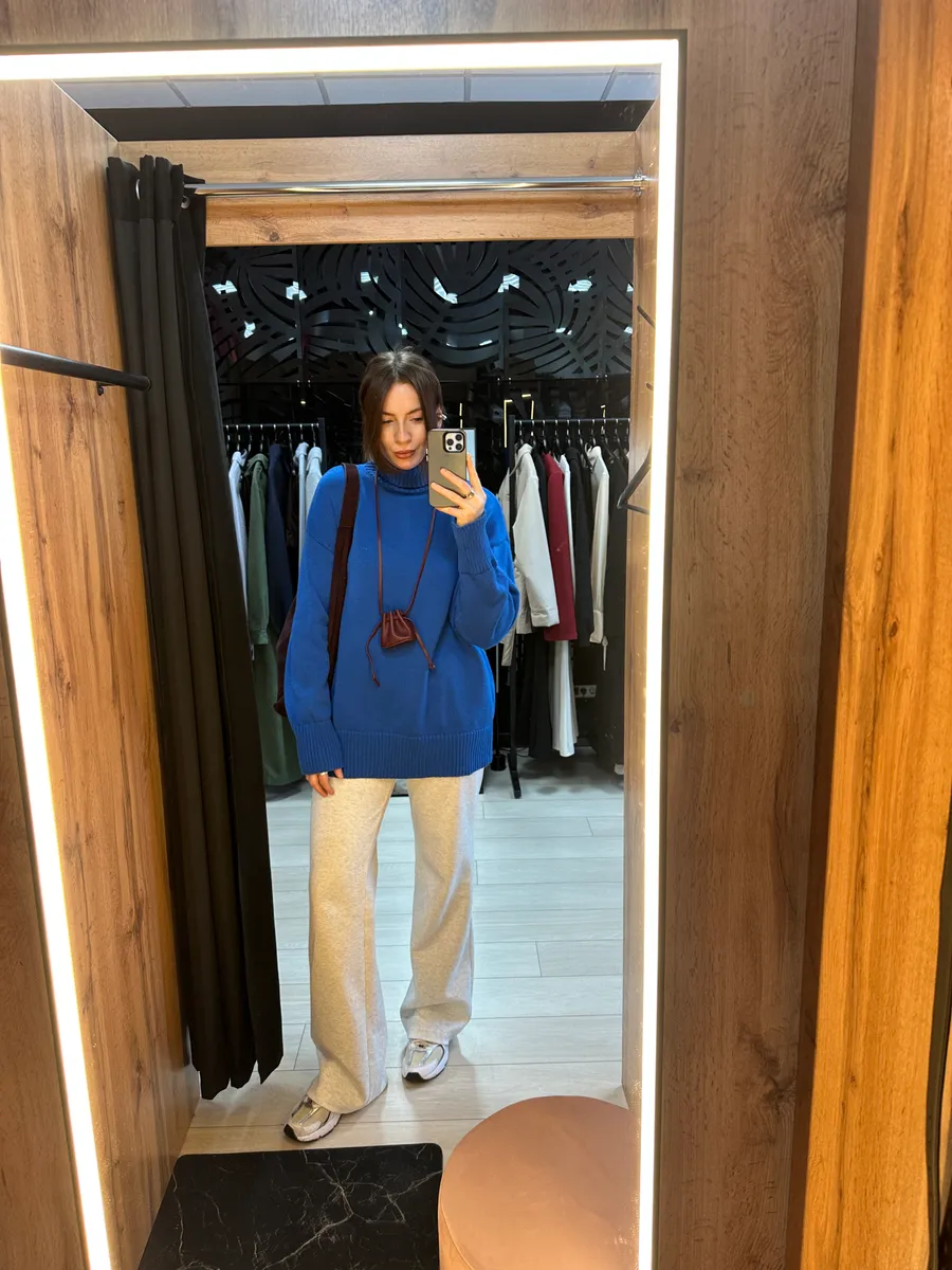 На Дарье (рост 182 см) уютный хлопковый свитер в оттенке электрик и трикотажные брюки Шон (подвернуты внутрь на 7см).