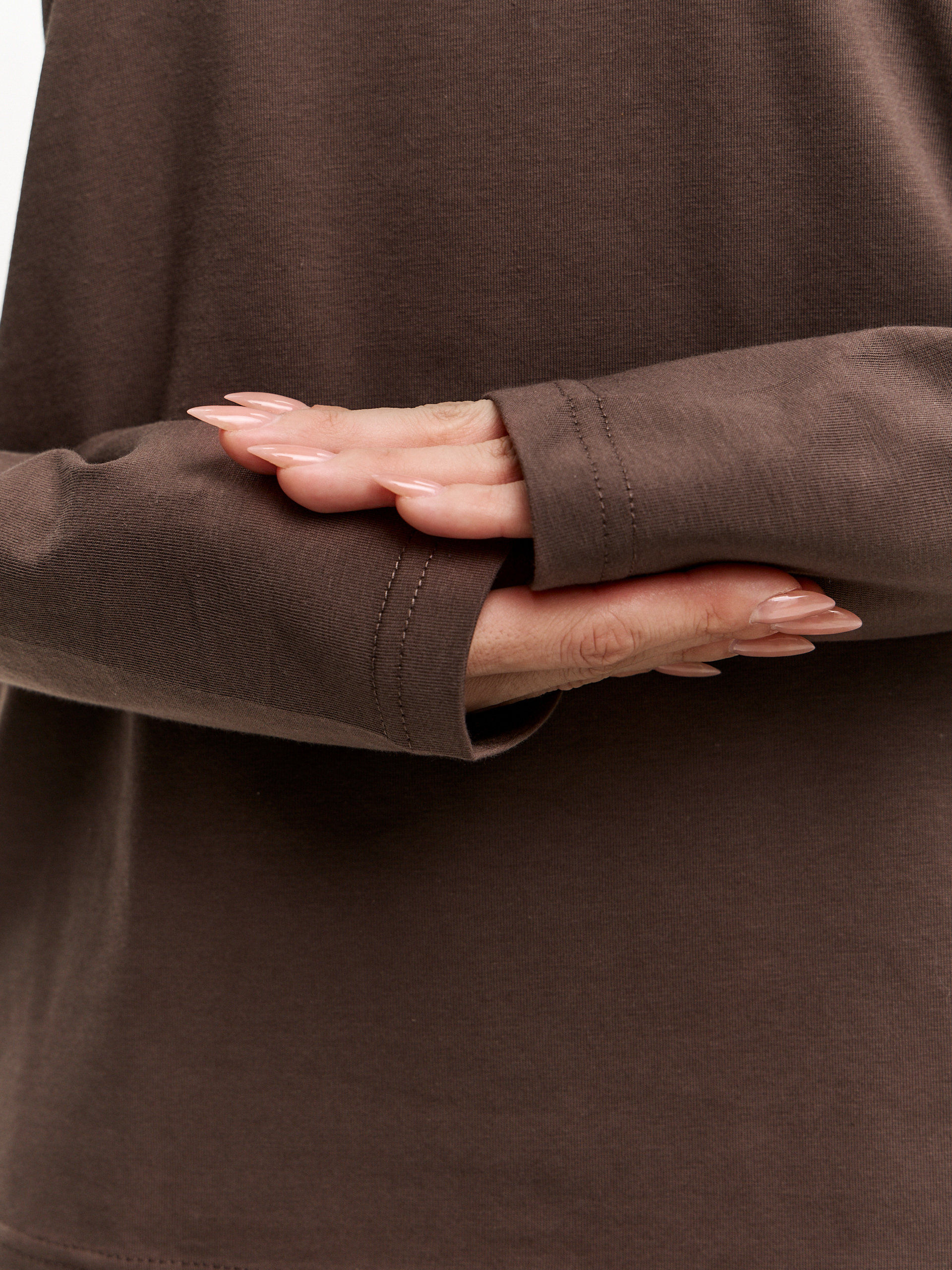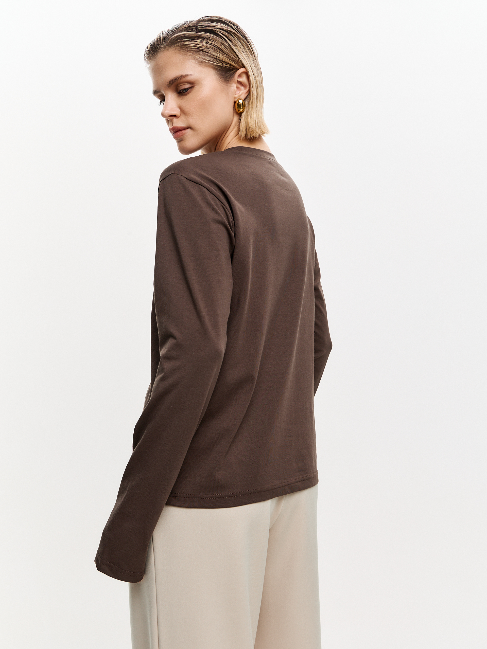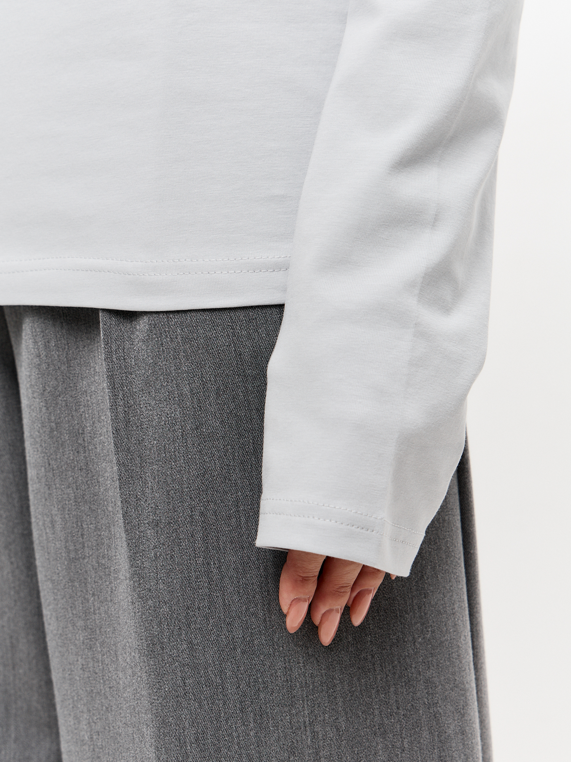 Лонгслив сшит из мягкого, приятного к телу материала на основе хлопка с небольшим добавлением лайкры для сохранения формы и цвета.