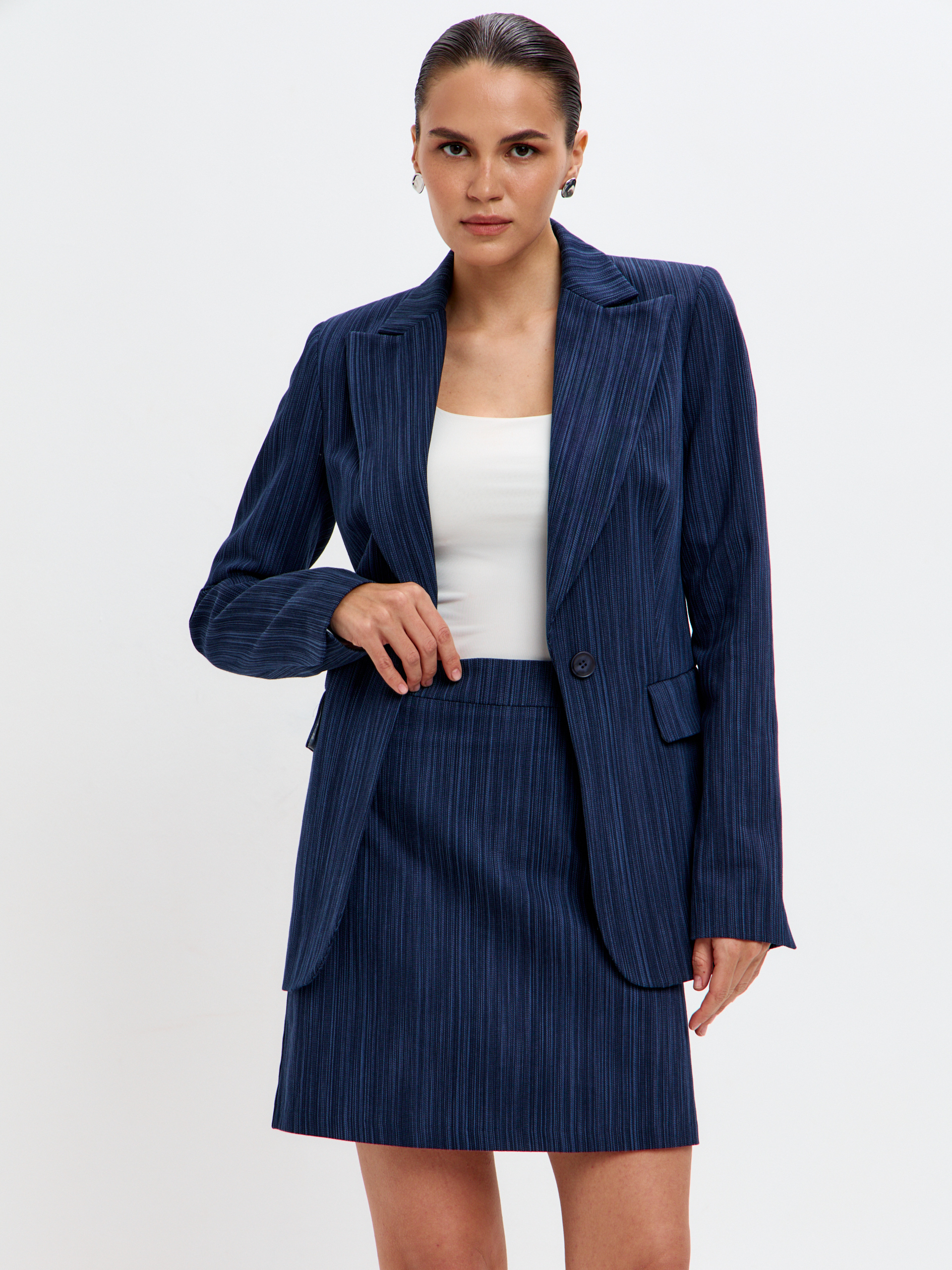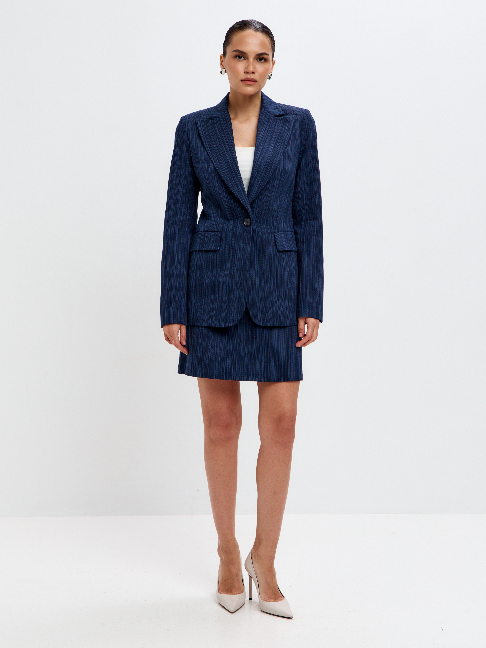 Бархатистая экокожа с флоковым эффектом красиво ловит свет и притягивает взгляды. В паре с жакетом из капсулы юбка превращается в выразительный костюм с характером — для вечеров, особых случаев и тех дней, когда хочется выглядеть на максимум. А соло она легко работает с водолазками и лонгсливами, объёмными свитерами и любыми вещами на контрасте.